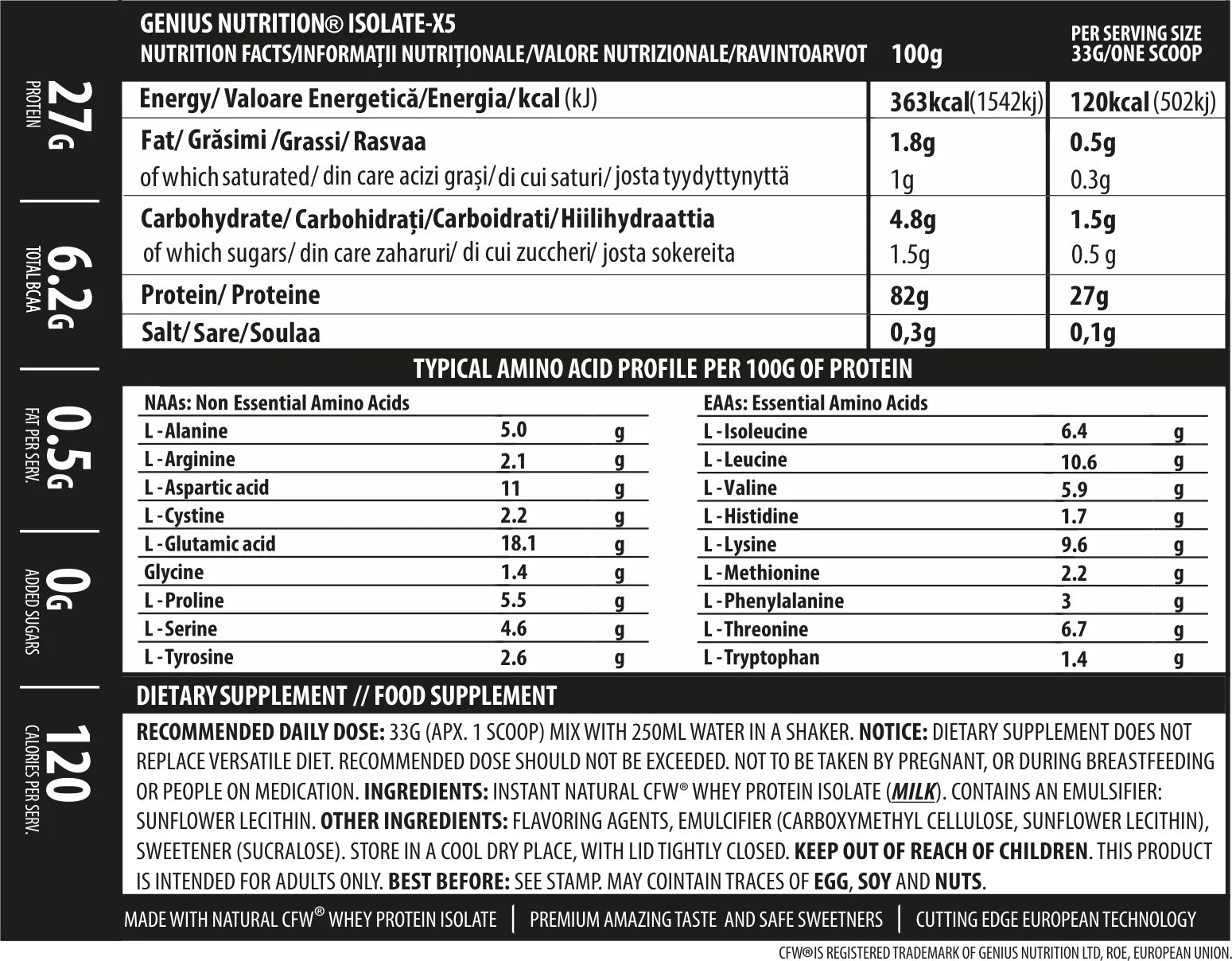 Dacă ești în căutarea unui supliment proteic de cea mai înaltă calitate, Isolate-X5 este alegerea perfectă! Cu 27g de proteină izolată din zer per porție, obținută prin filtrare naturală (CFW® – Cross-Flow Filtration), acest produs asigură o absorbție rapidă și o utilizare eficientă a nutrienților pentru dezvoltarea și refacerea musculară.