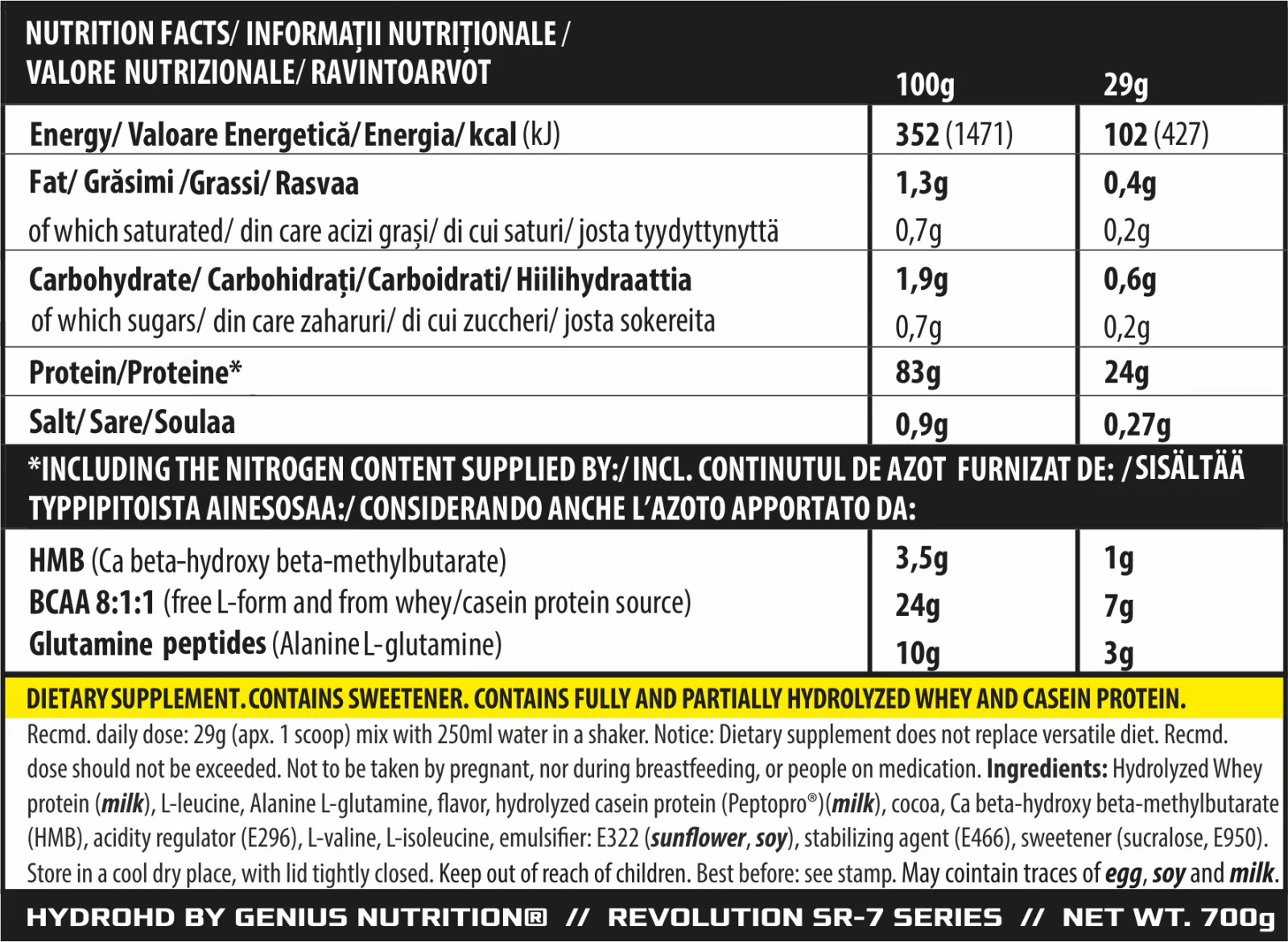 Proteina din zer hidrolizata (lapte), l-leucina, alanina l-glutamina, aroma, hidrolizat de cazeina (PeptoPro®) (lapte), cacao, HMB, regulator de aciditate (acid malic), l-valina, l-izoleucina, emulgator: lecitina (floarea soarelui, soia), agent de stabilizare (carboximeticeluloza sodica), indulcitori (sucraloza, acesulfam K).