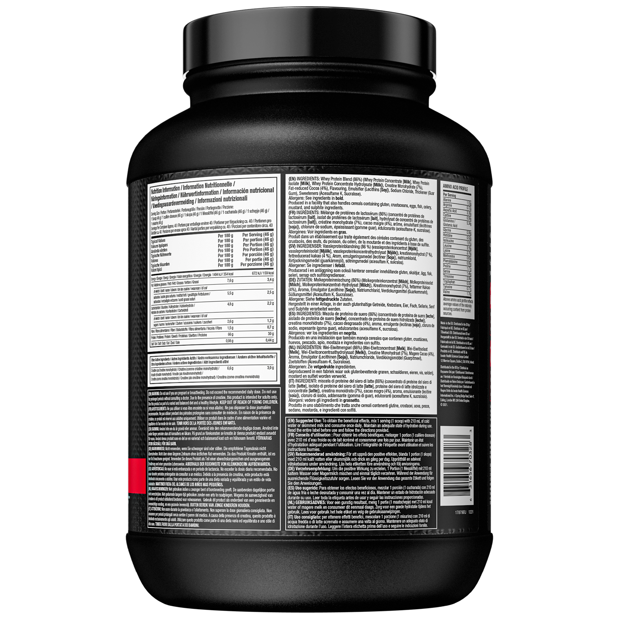 Blend de proteine din zer (Concentrat proeic din zer, izolat proteic din zer, hidrolizat proteic din zer), creatina monohidrata 3g, culoare (carbonat de calciu), arome, emulgator (lecitina din soia), clorura de sodiu, agent de ingrosare (guma Guar), indulcitori (sucraloza, acesulfam K).
