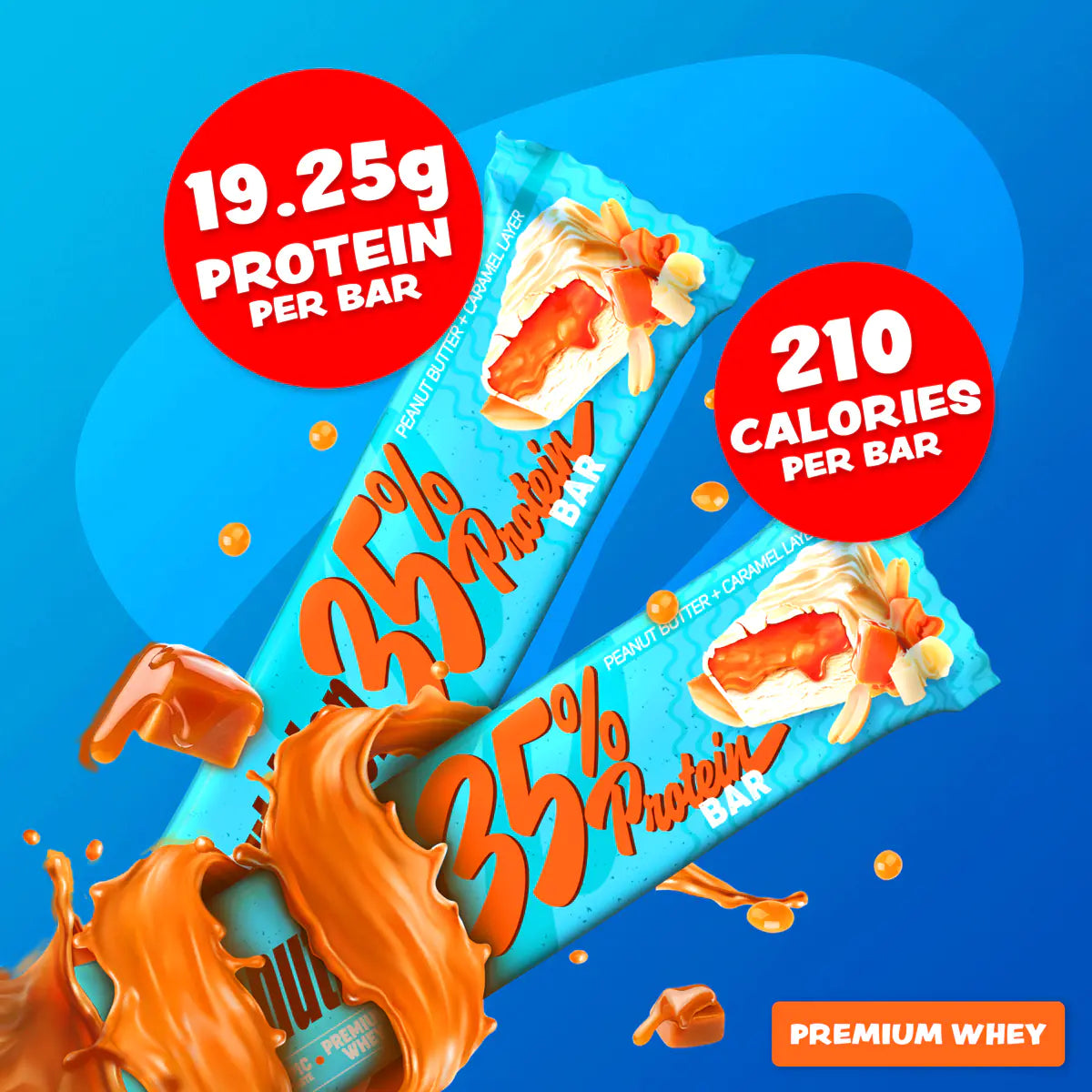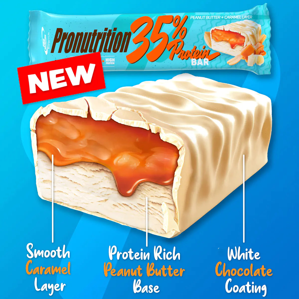 matrice proteică (izolat proteic din zer, hidrolizat proteic din zer, peptide de colagen, izolat proteic din soialapte praf integral), sirop de zahăr invertit, glazură de ciocolată albă (zahăr, unt de cacao, lapte praf integral, emulsifiant: lecitină de soia, aromă naturală vanilie), făină de migdale, sirop de maltitol, cremă de lapte (zahăr, grăsimi vegetale nehidrogenate, unt de cacao, lapte praf, zer praf, emulsifiant (lecitina rapiţă), sare), unt de arahide, grăsime din lapte pudră,  strat de caramel (sirop de glucoză, lapte condensat degresat, grăsime vegetală (ulei de cocos) emulsifiant: mono şi digliceride ale acizilor graşi, sare, aromă naturală), grăsimi vegetale nehidrogenate, extrudat de cereale (făina 92%: orez, grâu, porumb, zahăr, extract de malţ de orz, sare), sare, aromă.